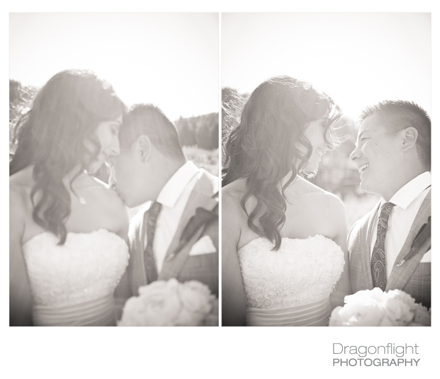 Clasping hands together whenever the chance arose, sneaking kisses, and sweet whispers were these two as we wandered the grounds taking photographs in the warm sun. It was an evening ceremony upstairs outlooking the green, mountains and view from the clubhouse. With family and friends crammed together excitedly to witness their vows, they said I do and made sure to greet each and every one of their guests on the way through to their cocktail reception.